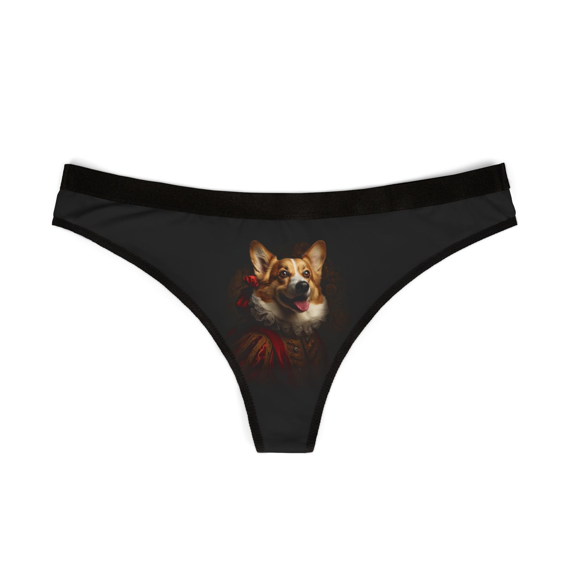 These Renaissance Corgi Thongs are a playful and unique addition to any lingerie collection. Featuring a renaissance-inspired corgi design, these thongs offer a comfortable fit and are made from breathable antimicrobial fabric. Perfect for corgi lovers and those who appreciate whimsical undergarments. Ideal for Valentine's Day, anniversaries, or as a fun gift.